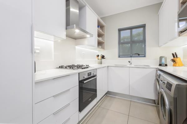 The sleek kitchen is fitted with modern cabinetry, a gas hob (Egoli Gas), space for two under-counter appliances, and a single-door fridge.