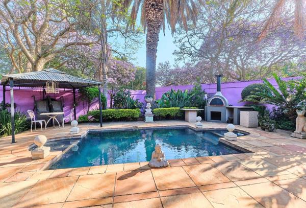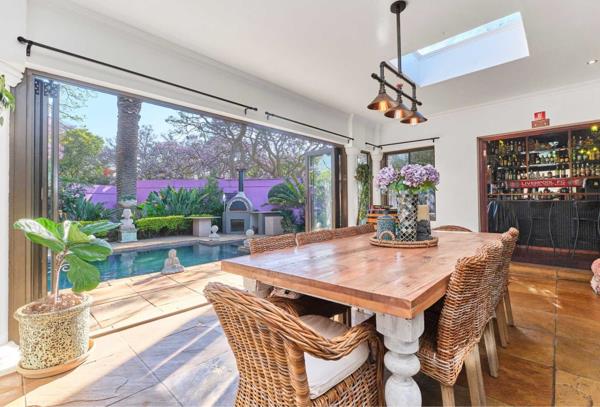 Step through the entrance hall into a very spacious lounge, with its inviting wood-burning fireplace and wood flooring. This flows smoothly into a proper formal dining room, also showcasing beautiful wood flooring. Then step onto an enclosed patio, with sky lights, opening via stackable doors onto an idyllic entertainment space with a sparkling blue pool, pizza oven, and boma fire pit, creating the ultimate setting for all year-round entertaining.