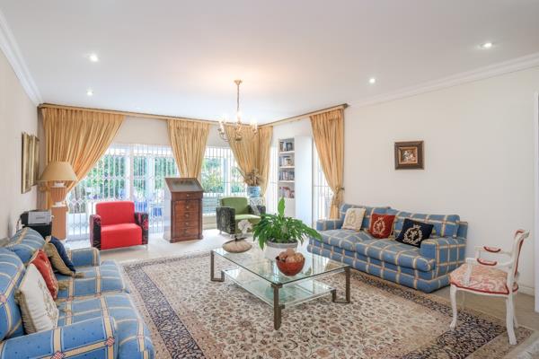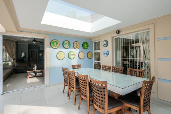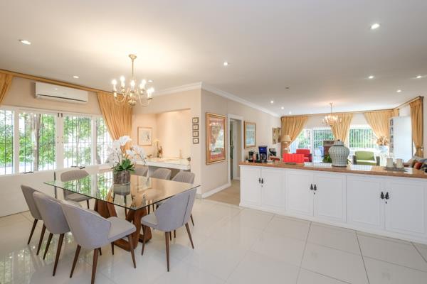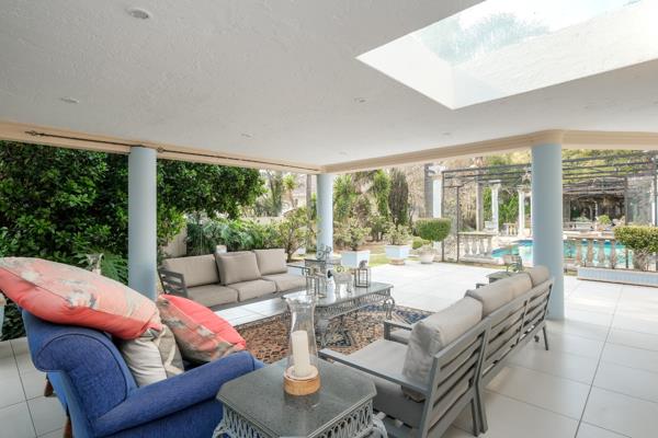 The patio easily accommodates a full lounge suite and 10-seater dining table,creating the ultimate entertainment setting. The beautifully designed garden boasts a sparkling swimming pool, elegant fountain, and a dedicated undercover entertainment area spacious enough to host functions.