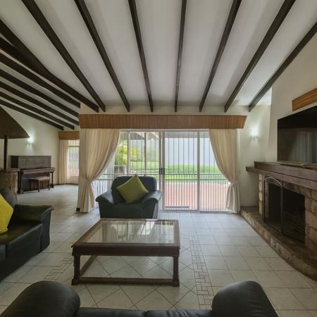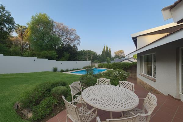 The separate kitchen includes a scullery and breakfast nook and is equipped with a gas stove, electric oven, water-filtration system and air-conditioning. The bedroom wing is positioned to one side of the home three of the four bedrooms are north-facing with picturesque views across the garden and pool. The main suite enjoys a walk-through dressing room and a full en-suite bathroom.