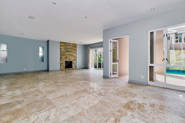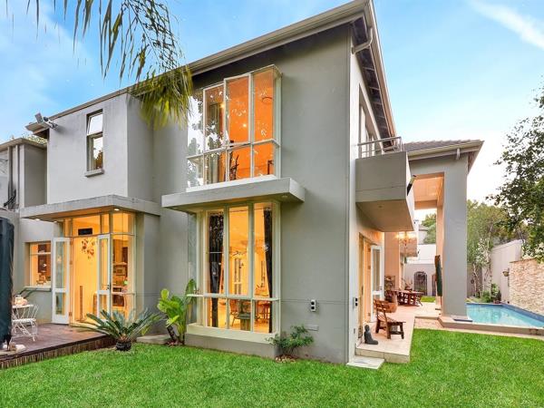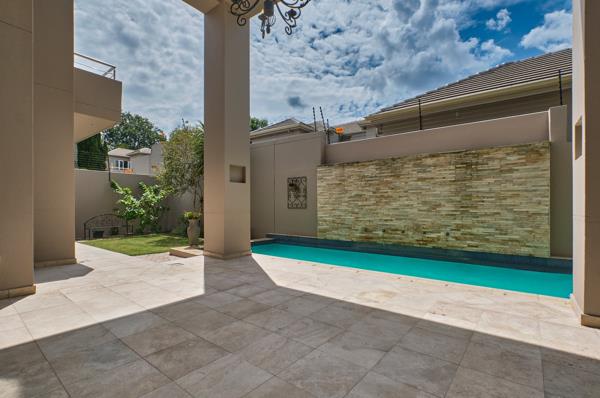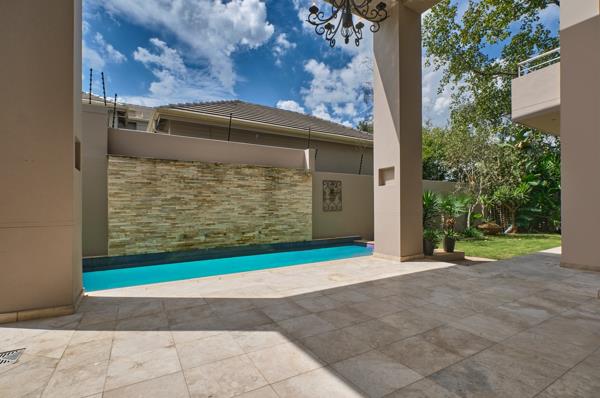 1 of 5 properties in magnificent cluster development, in 24 hour boomed security estate. This sensational cluster home on approx. 1000m with its earthy neutral tone is - just one of a kind. Layered and textured with a neutral and calming palette. A stunning and timeless design by renowned architect Krynauw Nel. Dramatic double volumes, floating staircase with exceptional and spacious reception rooms. Well-proportioned reception rooms flow out to fabulous expansive undercover patio, ideal for lavish entertaining. 4/5 Bedrooms (all en suite), study/5th bed with guest cloakroom. Beautiful landscaped garden with cascading salt chlorinated pool. Gas fire place, well designed kitchen, breakfast room, underfloor heating, ducted air-conditioning, bamboo flooring, travertine tiles and koi pond. Light and bright with high end finishes, reflecting originality and creativity in every room.