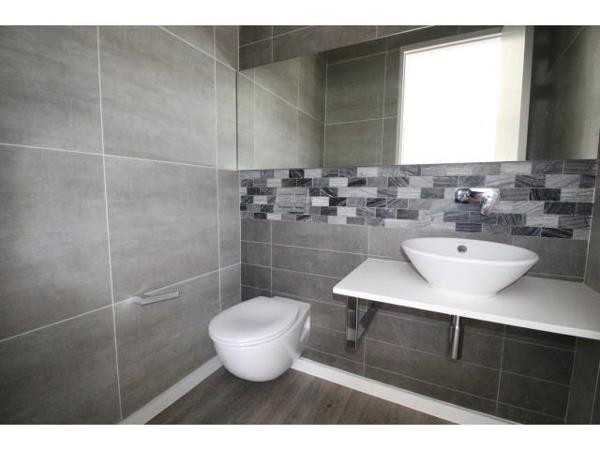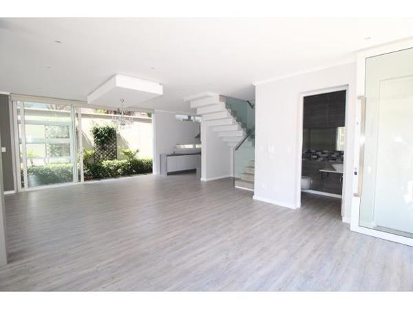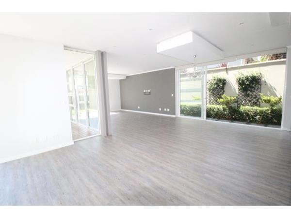 Open plan lounge and dining area leading out to an entertainment patio with built in braai and wooden deck