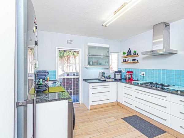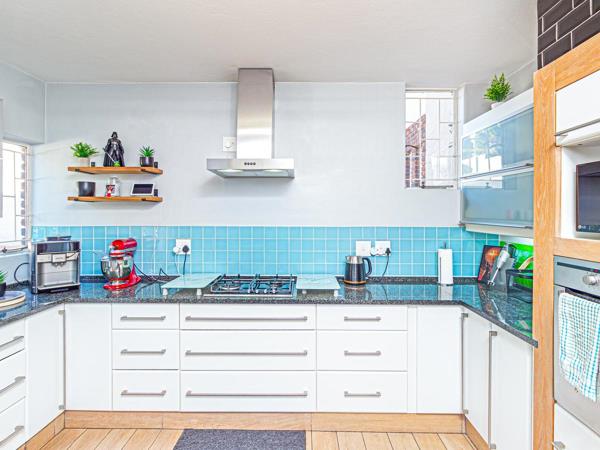 The main living area is located on the second level, where an open-plan lounge and dining area flow seamlessly onto a covered patio and a beautifully landscaped private garden. Whether you''re hosting a weekend braai or enjoying a quiet afternoon outdoors, this space is perfect for entertaining and relaxation. The sleek, modern kitchen is a chefs delight, equipped with stone countertops, a gas hob, and ample cupboard space. A convenient guest cloakroom completes this level.
