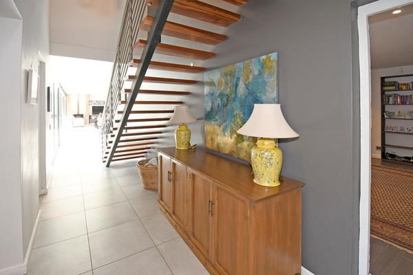 The expansive main bedroom, located downstairs, overlooks the pool and features a walk-through dressing area with air-conditioning and a magnificent en-suite bathroom. Upstairs are two more air-conditioned en-suite bedrooms and a cosy pyjama lounge, perfect for quiet evenings or family time.