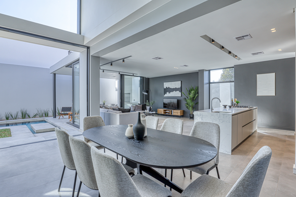 A selection of six plot-and-plan opportunities and one completed show home is now available, allowing buyers to either choose their ideal stand and home type or experience the finished architectural vision firsthand. Each north-facing, double-storey residence ranges from 333m2 to 447m2 and has been thoughtfully designed to maximise natural light, spatial flow, and privacy. Modern volumetric forms, high ceilings, and internal atriums create an uplifting sense of openness, while refined material palettes and premium specifications elevate every room.