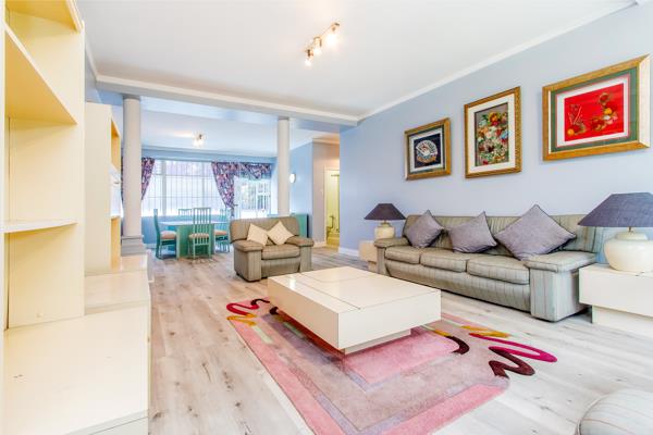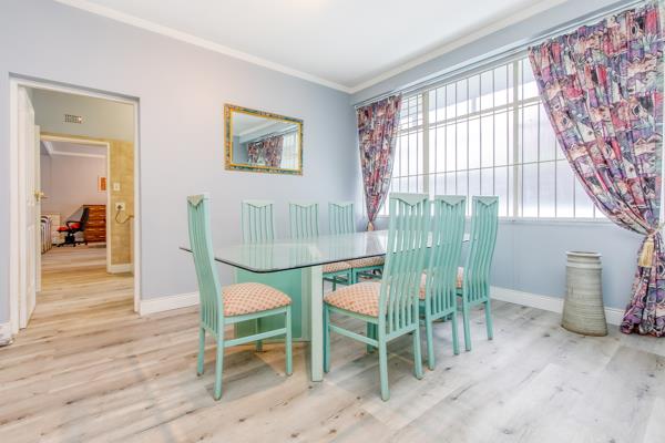 Open-plan dining and lounge area with large windows that fill the space with natural light.