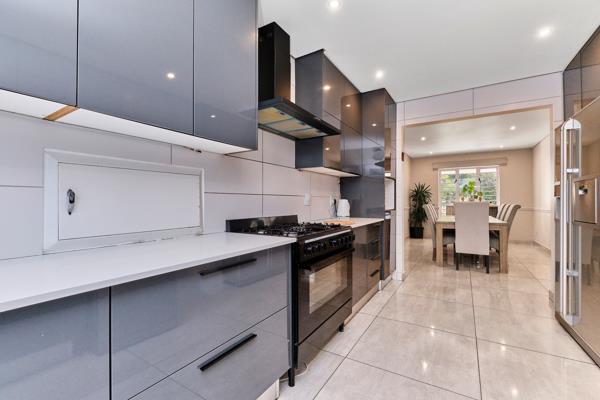 Adjacent to the lounge, the dining room offers a lovely flow and garden views, creating a warm space for shared family meals. The kitchen is a standout feature sleek and functional with white granite countertops, high-gloss grey cabinetry, a five-plate gas stove with extractor, electric oven, and space for a double-door fridge and one under-counter appliance. A door leads to a private courtyard and drying yard, which leads directly to the separate laundry area and the two garages for added convenience.