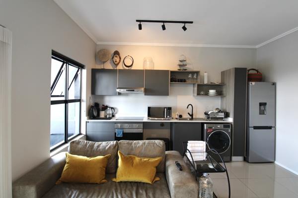 A welcoming entrance hall opens into a sun-drenched, open-plan living area that flows effortlessly to a sleek, modern kitchen fitted with space for a single-door fridge and one under-counter appliance.