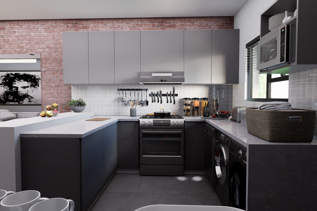 - An open-plan living area complete with a modern kitchen, gas stove, electric oven, and space for three appliances