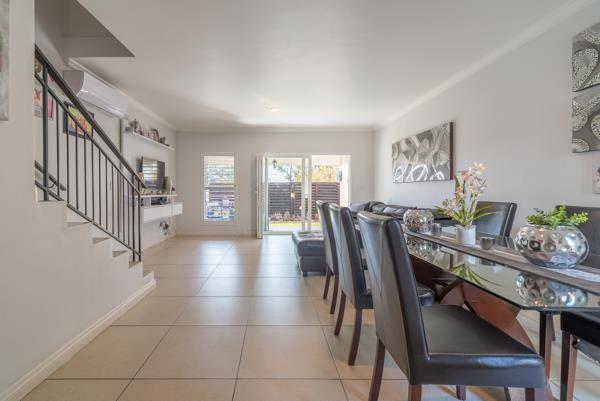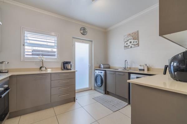 This modern residence boasts a thoughtfully designed open-plan layout, with the lounge and dining spaces flowing seamlessly into a chic, modern kitchen. Outfitted with stone countertops, a gas hob, undercounter oven, and space for two appliances, the kitchen is as practical as it is attractive. Just off the kitchen, a separate courtyard adds convenience for laundry and storage, while a built-in cupboard under the stairs offers additional space to neatly stow away household items or cleaning supplies.