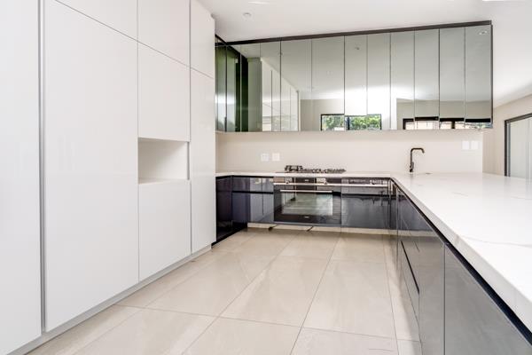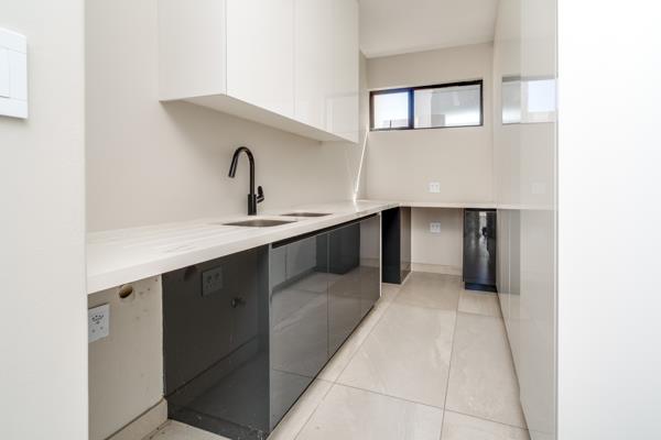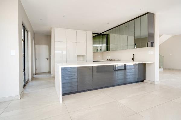 At the heart of the home, the gourmet kitchen impresses with a 6-burner Siemens gas hob and oversized oven, stone countertops, sleek soft-close cabinetry, and provision for a fully integrated fridge and freezer. A separate scullery and walk-in pantry maintain the clean, minimalist aesthetic while offering ample functional space. Designed for seamless entertaining, the kitchen connects effortlessly with the living and outdoor areas.