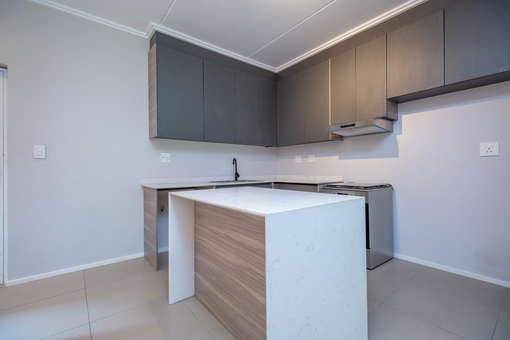 Downstairs the kitchen with ample cabinets, a central island, gas hob and electric oven as well as undercounter space for two appliances seamlessly flows into the open-plan living living area. Lounge with feature wood burning fireplace and stacking doors to covered patio and and private garden.
