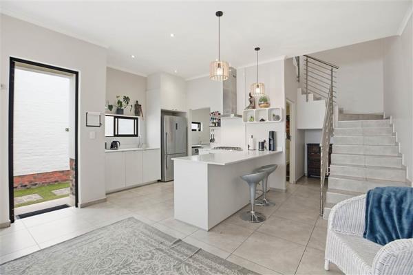 This flow continues through the spacious dining and lounge area, to the covered patio, accessed via aluminum stacking doors, complete with a built-in braai and private garden. Perfect place for a family to unwind together.