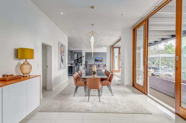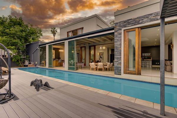 The entrance hall leads into expansive open plan living areas where a sleek modern kitchen, complete with scullery and central island, flows into the dining space. From here, stackable doors open to an enclosed, full length patio with a built in bar, creating the ultimate entertainment zone. This area flows out to a deck and sparkling pool, perfectly positioned to soak in breathtaking sunset views. A cosy TV lounge, family room with under stair wine cellar, and a study with garden outlook round off the ground floor. Two guest bathrooms add convenience.