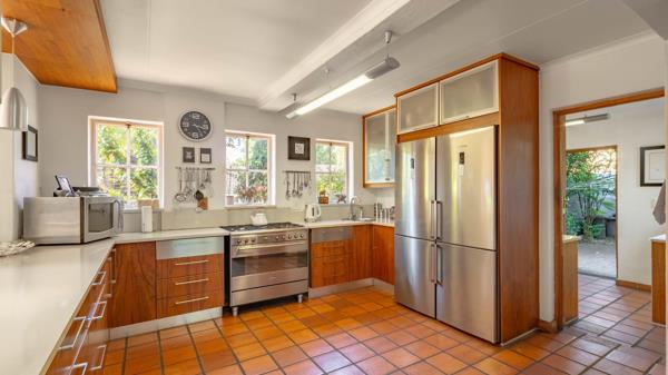 The home features four spacious bedrooms, two full bathrooms, and a guest bathroom. The main bedroom includes a luxurious en-suite bathroom with a heated towel rail for added comfort. A dedicated home office provides an ideal workspace, while the open-plan lounge with a Morso fireplace and dining area create a warm and inviting atmosphere. The modern kitchen is fitted with a gas stove, breakfast counter, walk-in pantry, and separate scullery. The living spaces open to a covered patio with built-in braai, overlooking a sparkling pool and lush, landscaped garden -- perfect for entertaining and family gatherings.