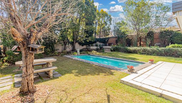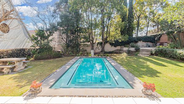 The large, lush garden is a private oasis, featuring a sparkling swimming pool and two beautiful water features that add to the serene ambiance. The sale includes all loose items, excluding the large fridge in the garage, and features modern, energy-saving light fittings throughout. The property also includes two domestic quarters. Full plans and details are available for this exceptional offering.