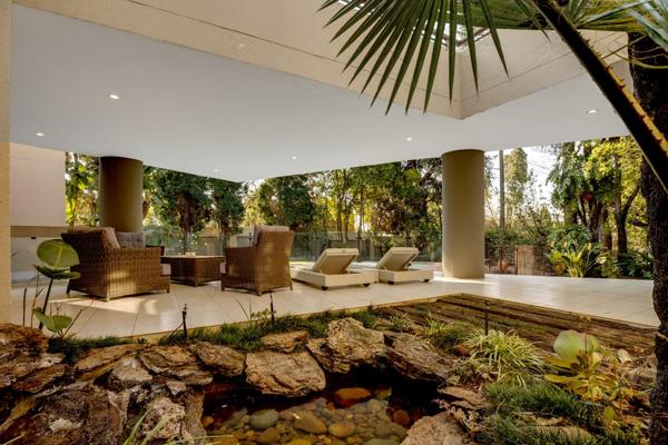 room, bar and cellar, steam room and gym, gardens with an enchanting firepit, a luxury swimming pool, various visual ponds, and hidden atriums, tucked away upon more than an acre of prime real estate within an enclave of 6 homes in a private but convenient and secure space on one of the most upmarket roads in Bryanston.