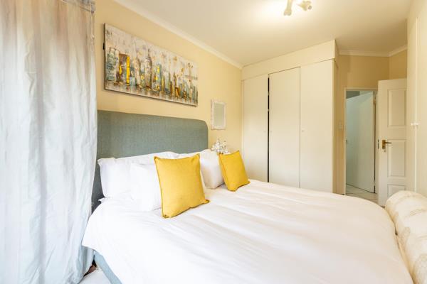 The bright and spacious living area is filled with natural light and opens effortlessly onto a north-facing balcony, ideal for relaxed mornings or sundowner evenings. Rich wooden finishes throughout add character and warmth to the space.