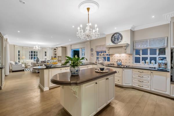 The double-volume entrance hall with beautiful French oak flooring and chandelier leads to three spacious reception areas comprising formal lounge and dining room (both with fireplaces) and family room, all opening out to an expansive covered patio illuminated by skylights and enjoying a relaxing vista over the gardens and pool.