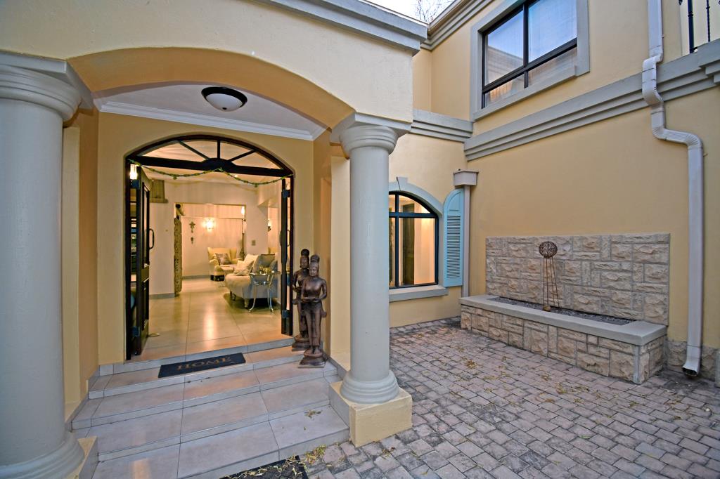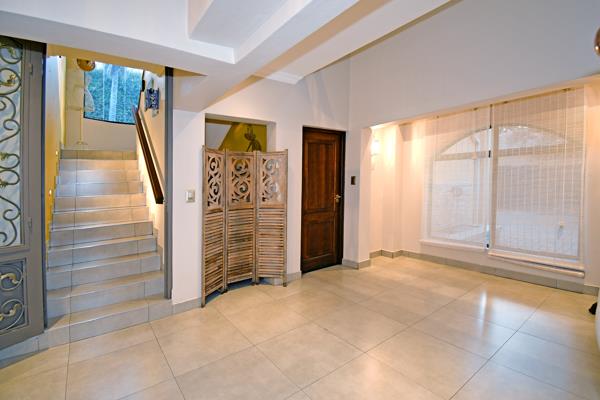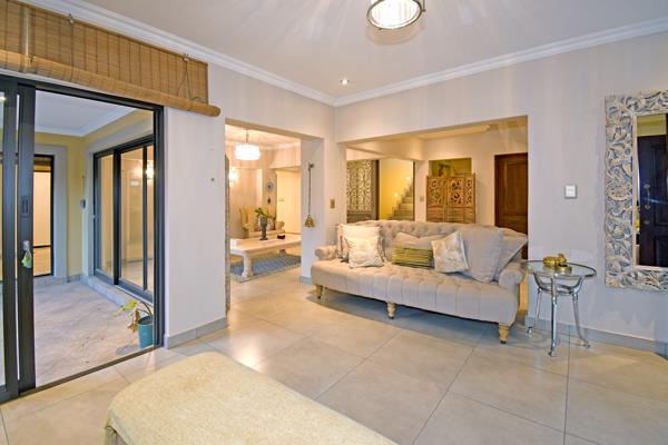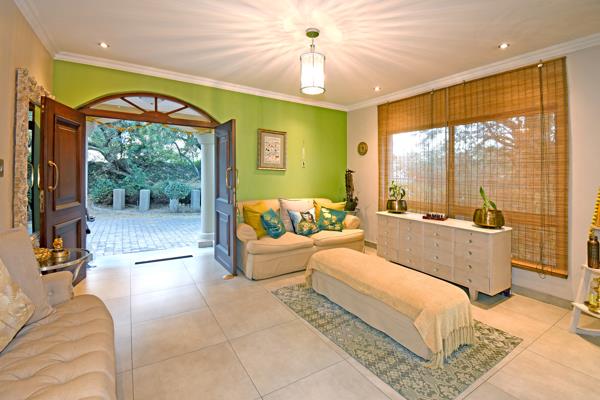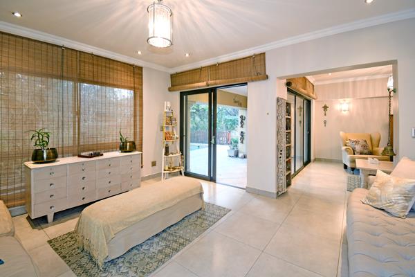 Receptions lead to the covered entertainment patio overlooking the landscaped garden and pool.