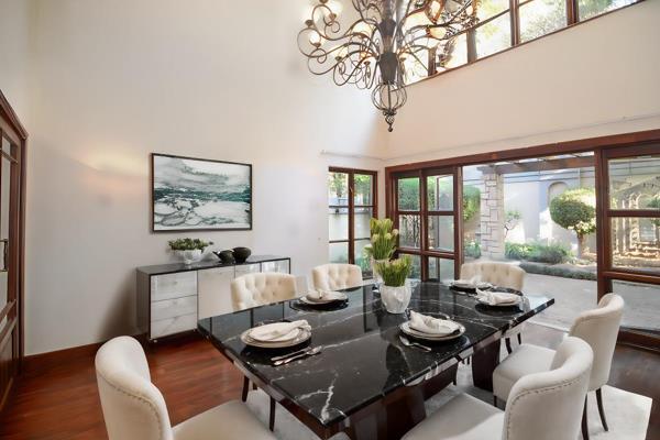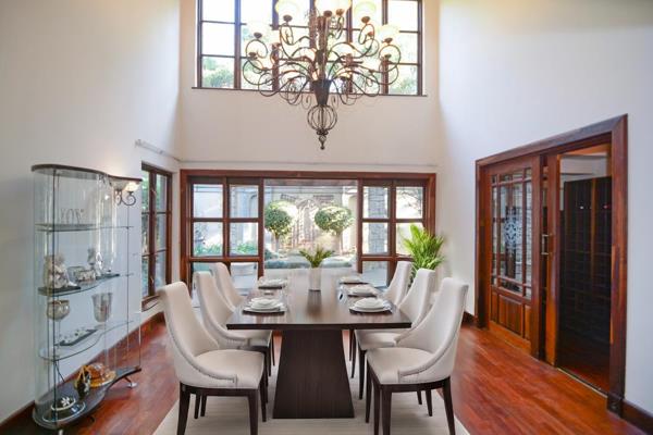 Upon entering through the grand wooden door, you''ll be welcomed by an impressive double-volume foyer The open-plan layout of the kitchen and family room flows effortlessly into the other expansive living areas on the lower level. Here, you''ll find a formal lounge with a charming fireplace, a sun-drenched breakfast room, a dining room featuring a wine cellar, and a covered patio equipped with a built-in gas braai. Large wood and glass doors throughout the home provide the flexibility to create either an open or more formal environment as desired. The kitchen is beautifully appointed with granite countertops, a gas hob with an electric oven, and an extended pantry and scullery area. The backyard also offers a delightful space suitable for a herb garden.