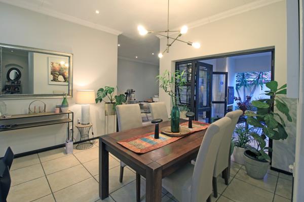 The stylish white kitchen, complete with a built-in fridge, gas stove, and black sink, offers modern functionality with space for a drinks fridge. A cosy gas fireplace adds warmth, while the wood braai, never used, awaits your culinary creativity.