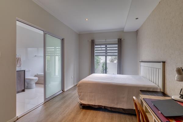 This unit offers an open-plan living area with ample space for a large lounge and dining set. Complimented by a stylish kitchen and centre island. Off of the living area is a decked patio a low-maintenance garden. All 3 bedrooms are well-sized and private, with the main en-suite and a guest bathroom shared. Shearwater offers practical living, and excellent 24-hour security, with easy access into Sandton. The complex also has a communal swimming pool and mini fitness center.