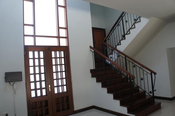 Ascend the charming wooden staircase to the upper level, where youll discover a cozy pyjama/TV lounge, perfect for late-night chats or lazy mornings. The main bedroom is a true retreat, boasting a luxurious his-and-hers en-suite bathroom, a spacious walk-in closet, and CCTV cameras for added security. Two well-sized guest bedrooms each come complete with built-in cupboards and their own en-suite bathrooms, ensuring comfort and privacy for all.