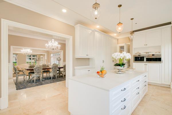 The kitchen is a culinary masterpiece, bathed in natural light and designed with impeccable taste. Featuring floor-to-ceiling white cabinetry and pristine marble countertops, it is equipped with state-of-the-art appliances, including a gas stove, two double ovens, and a central island with a breakfast bar. A fully fitted scullery complements this impeccable space.