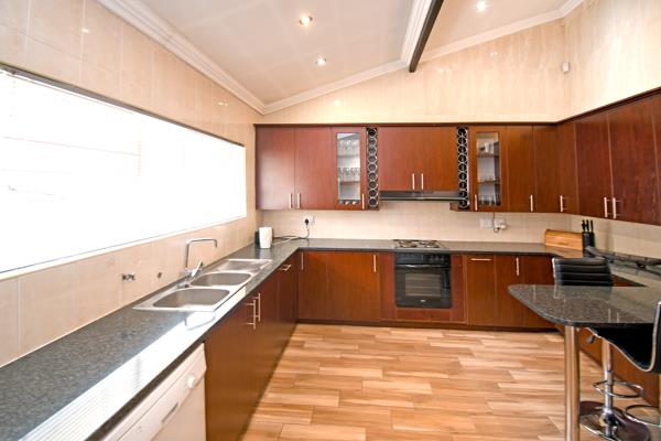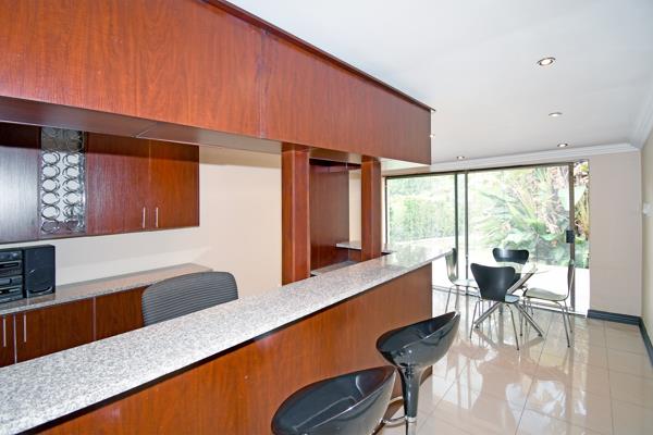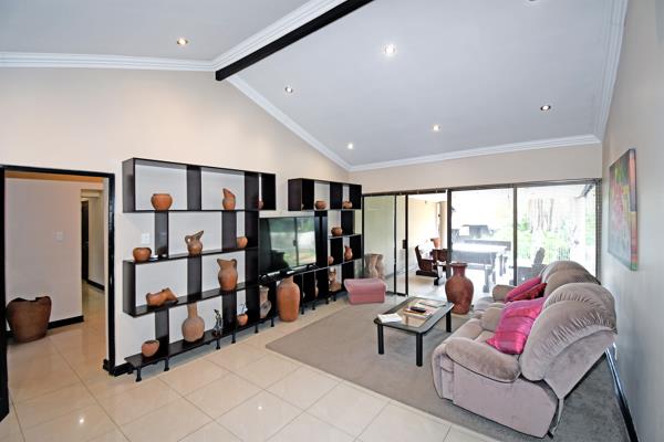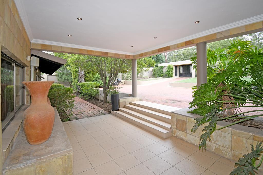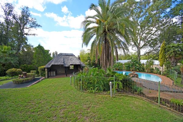 Covered patio overlooking the mature garden (irrigated by borehole) with a beautiful pool, fish pond and lapa with a braai & bar.