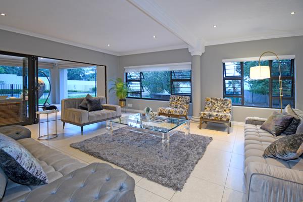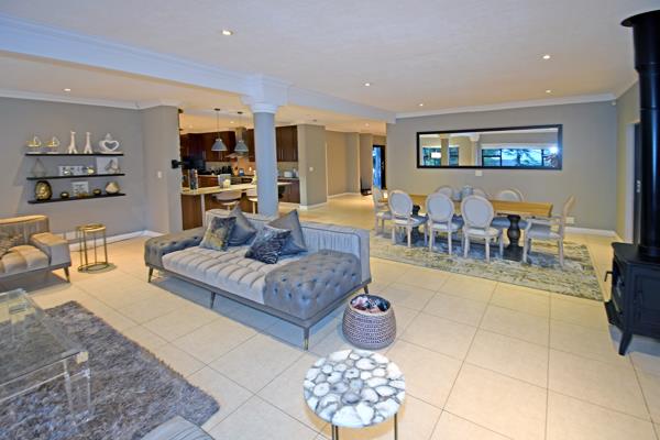 Expansive, open plan receptions leading to a large patio with a built-in braai androll down blinds overlooking an irrigated garden with a Boma area & Tennis court.