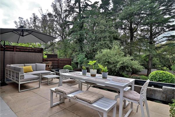 Gourmet open-plan kitchen with Quartz counters, gas hob, space for a double door fridge, wine racks, movable centre island and excellent cabinetry spacious lounge and dining area featuring a gas fireplace and extra storage space enclosed sun-room/patio with built in braai and drinks cabinet, ideal for all round relaxing and entertaining private terrace and garden boasting water features, special garden lighting and an irrigation system, making it the ideal spot for al fresco dining or simply relaxing whilst enjoying the stunning views guest cloakroom for added convenience.