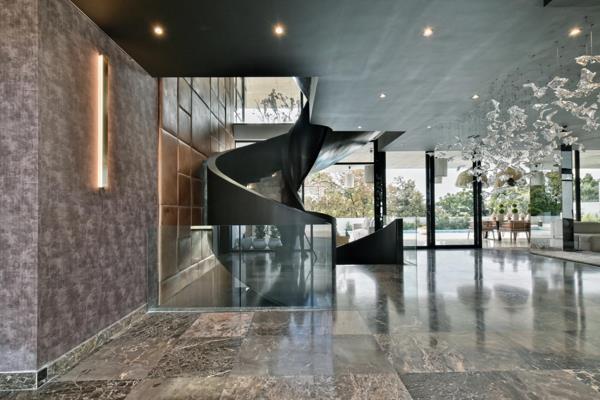 Striking double-volume entrance with a glass front door and elegant spiral staircase
