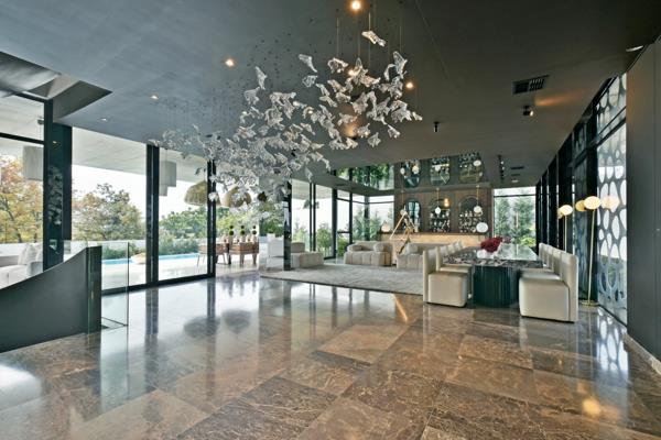 Floor-to-ceiling glass doors open to a covered terrace with rim-flow pool and expansive landscaped garden