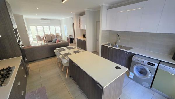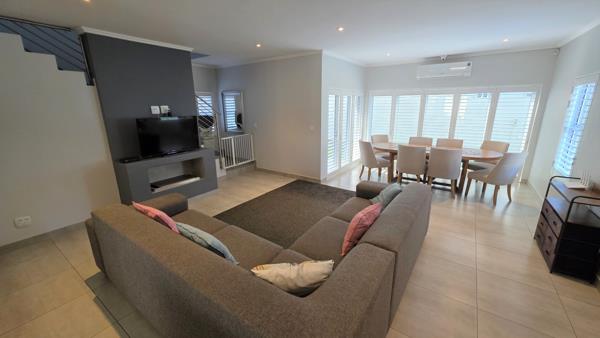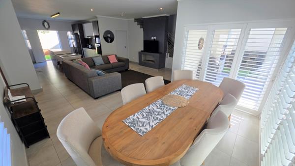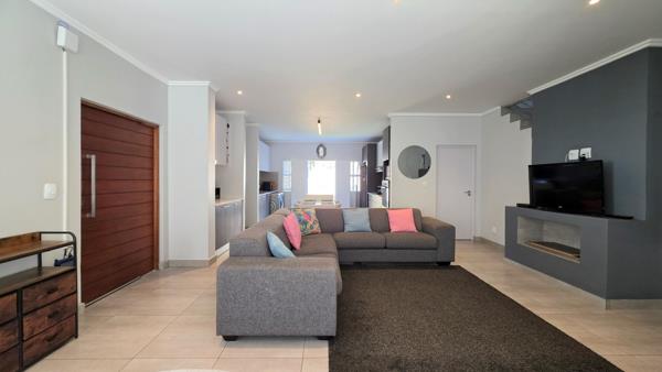 Upon entry, youre welcomed into a light-filled, modern open-plan living area adorned with American Shutters throughout. The expansive layout includes a spacious lounge with a cozy gas fireplace, a modern open-plan kitchen, and a sophisticated dining area with air-conditioning for summer comfort. The dining area flows effortlessly through sliding glass doors to a covered patio complete with a built-in braai, overlooking a wrap-around gardenperfectly sized to accommodate a future swimming pool.