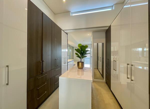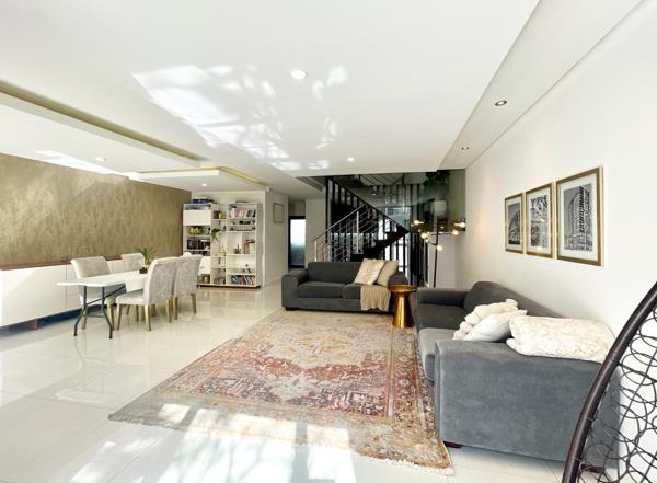 Spacious open-plan living at its best. The modern designer kitchen boasts high-gloss cabinetry, with Caesarstone countertops and a feature waterfall island with LED lighting. Space for a double fridge, all SMEG appliances including an induction stove and oven, and 3 under-counter SMEG appliances which are all included. The kitchen flows to the open-plan living area consisting of a lounge area and dining room. These areas open out through glass sliding doors to a small no-maintenance garden area. Completing downstairs is a guest toilet.