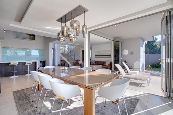 The ground floor is designed for seamless indoor-outdoor flow, the formal lounge, dining area, and family room opening via frameless stacking doors onto a covered patio featuring a built-in gas braai and prep bowl. The gourmet social kitchen boasts Italian stone countertops, integrated premium Italian appliances, a separate scullery with a pantry, a walk-in cold room, and a combustion fireplace. Completing this level: a well-appointed guest suite and a dedicated home office.