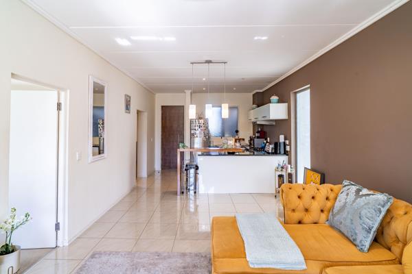 As you walk into the home, you are greeted into a large living area with views right out to the end of the complex. The kitchen on the left boasts an open-plan and functional layout with gas stovetop, fridge space and an appliance connection. The countertops feature an extended wooden counter for optional bar stools or simply used as a serving table. This opens onto a dining area with space for a 6-seater dining table and further opens onto a large lounge space with fiber connection. This living area flows out onto a large, private balcony overlooking the sparkling complex pool.