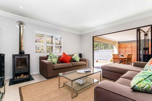 The heart of the home is an open-plan kitchen, complete with a separate scullery, which flows seamlessly through stacking doors onto a covered patio ideal for year-round entertaining. This inviting space overlooks a sparkling pool and a beautifully maintained garden, creating a serene and private outdoor retreat.