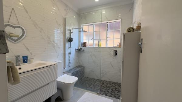 Fully tiled bathroom with walk-in shower, toilet, and basin