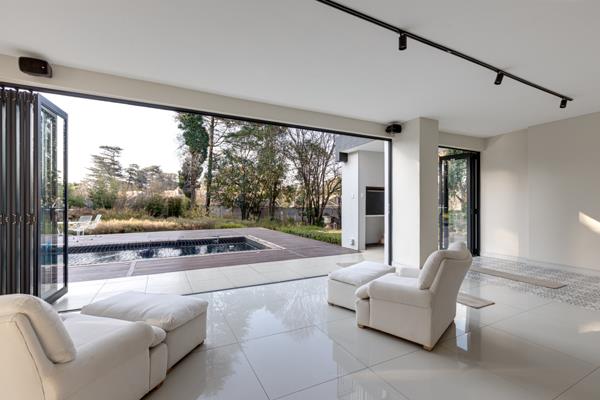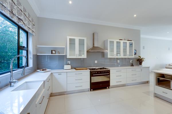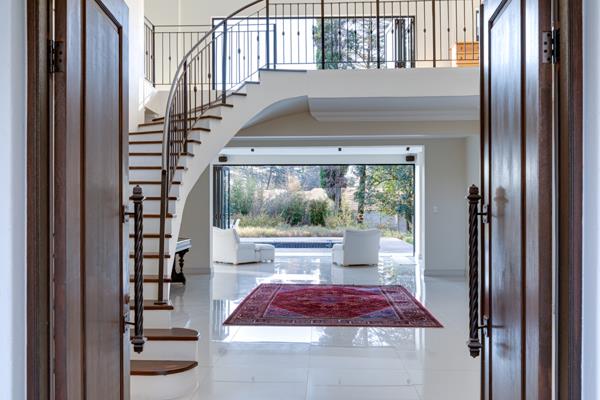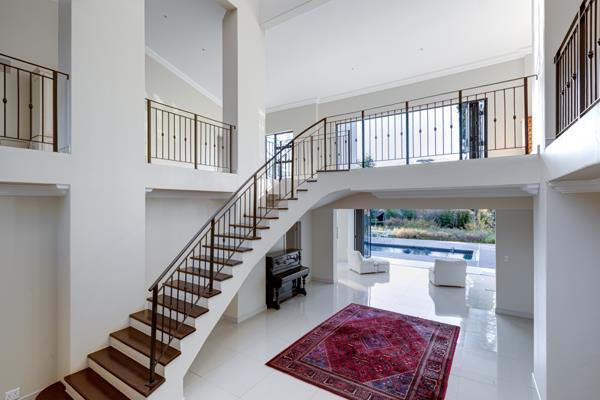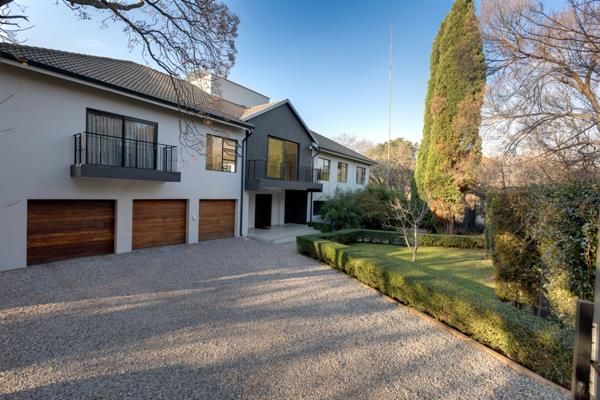 From the welcoming gravel courtyard, the volumed entrance opens onto sky-lit receptions flowing to enclosed patio overlooking lush gardens and pool. Modern kitchen with central island, Caesar-stone counter tops, gas hob, sep. scullery and laundry, open-plan to vast receptions (family room / dining room) with central fireplace and stacking doors opening to breakfast courtyard and herb gardens. Study and gym. 4 Bedroom suites upstairs, incl. indulgent main opening to balcony with dressing room. 4.5 Bathrooms. Expansive pyjama lounge opening to balcony. Top security, garaging for 3 and separate self-contained guest flatlet / luxury staff. PLUS Separate self-contained cottage comprising: Private entrance, secure parking, lounge / dining, loft room, 2 bedrooms, bathroom. A magnificent environment and home in a prime location in which to raise your family!
