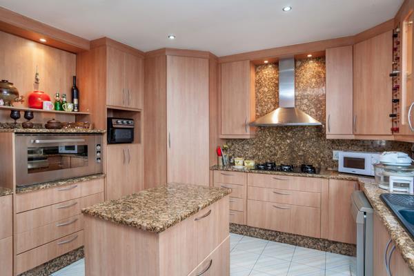 The layout flows effortlessly into a comfortable family TV room and dining area, ideal for relaxed evenings or hosting guests. At the heart of the home is a well-appointed kitchen, complete with granite countertops, a central island, gas hob, eye-level oven, extractor fan, and a pantry for additional storage. The adjacent scullery offers space for one appliance, while a separate laundry room accommodates two more.
