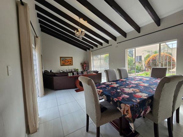 Tiled floors greet you at the entrance, flowing to the open plan living, dining room with elegant beams
