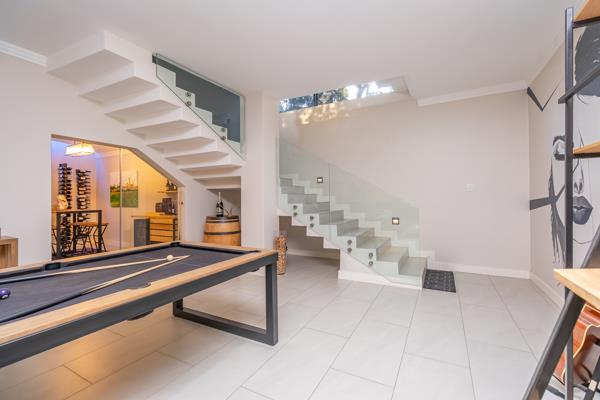 From the middle level, you descend to the entertainers level. This level is an entertainers dream, offering fitted home theatre, bar, fitted wine room and lounge with enclosed wood-burning fireplace and sliding doors onto the landscaped garden.