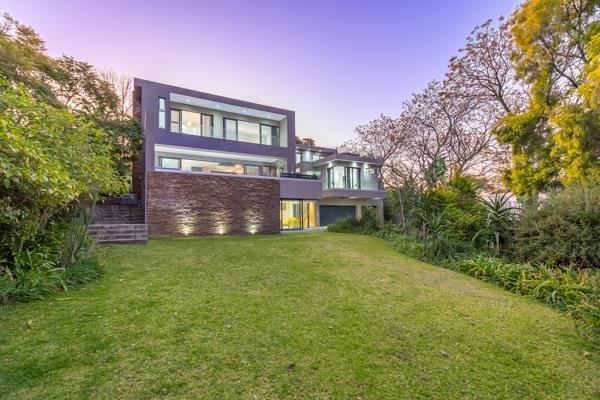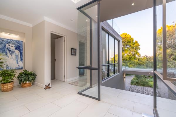 The impressive double volume glass entrance, with high ceilings, floor-to-ceiling windows, leads to the middle level, offering a chefs kitchen and spacious reception rooms with a wood-burning fireplace. All reception rooms flow to the entertainers patio with built in gas braai, bar and sparkling pool. An entertainers dream with a firepit and uninterrupted panoramic views.