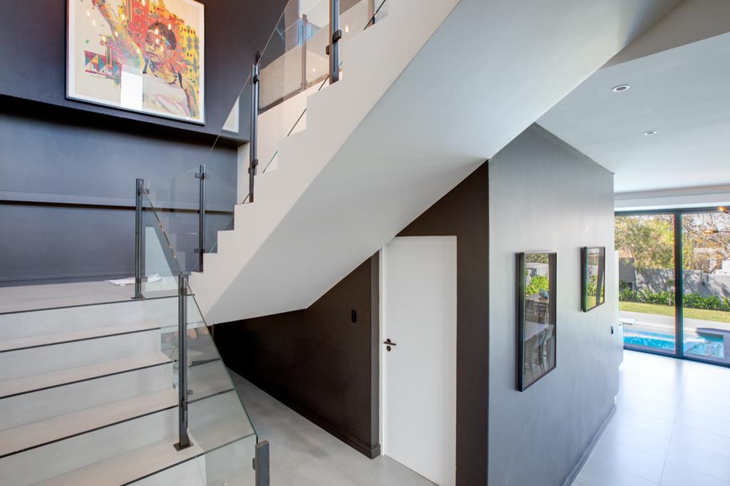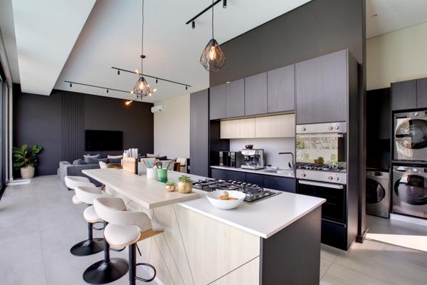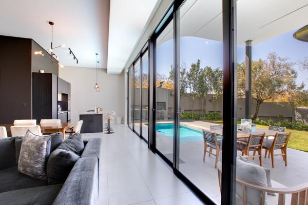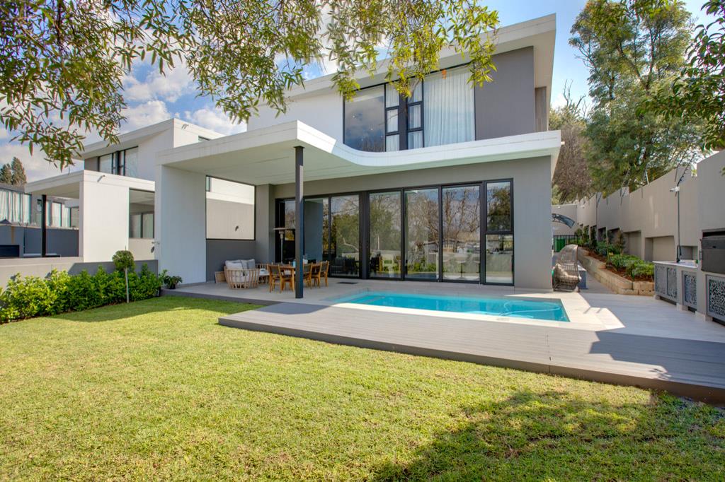 A newly-built, contemporary masterpiece set within the Hamilton Village Security Enclosure in Bryanston East. Offering fastidious attention to every detail, this minimalistic home offers the finest quality coupled with workmanship and precision. From the volumed entrance, open plan receptions with floor-to-ceiling doors and windows, and recessed lighting spill to the entertainer''s covered patio with built-in braai area overlooking pool and level lawns. Open-plan kitchen with gas hob, central island and sep. scullery. 3 Double bedroom suites upstairs incl. airconditioned main suite with dressing room, study / pyjama lounge with blinds. 3 Luxury bathrooms, guest cloakroom. Automated, tiled garaging for 2. Good security incl CCTV, aluminium windows and door frames.