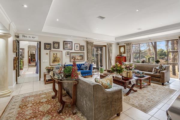 The seamless layout blends formal and informal living areas, with the main lounge and dining room extending onto a generous covered patio equipped with a built-in braai. A second, more relaxed lounge with a gas fireplace connects to a stylish, fully fitted bar and wine cellar, making this home an entertainers dream.