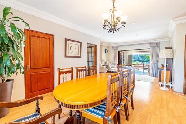 The entrance hall sets the tone, leading on one side to a formal lounge, separated by double doors. On the opposite side, the hall opens into a dining area that spans the full width of the home, allowing a smooth flow from the kitchen directly to a spacious covered patio with Trellidoors. The family room, also connected to the large covered patio, is filled with natural light through expansive windows overlooking the garden and pool. Wooden doors between rooms provide the option to create separate spaces or maintain the open-plan feel.