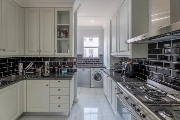 The main living area, situated on the next level, showcases a beautifully designed kitchen featuring top of the line SMEG appliances, a gas hob, extractor fan, sleek quartz countertops, and a generous scullery with space for three appliances.