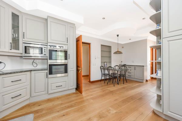 The spacious kitchen is the true heart of this home, offers elegant granite countertops, a breakfast bar for casual dining, built-in Miele appliances, a pantry, and a separate scullery accommodating three appliances.